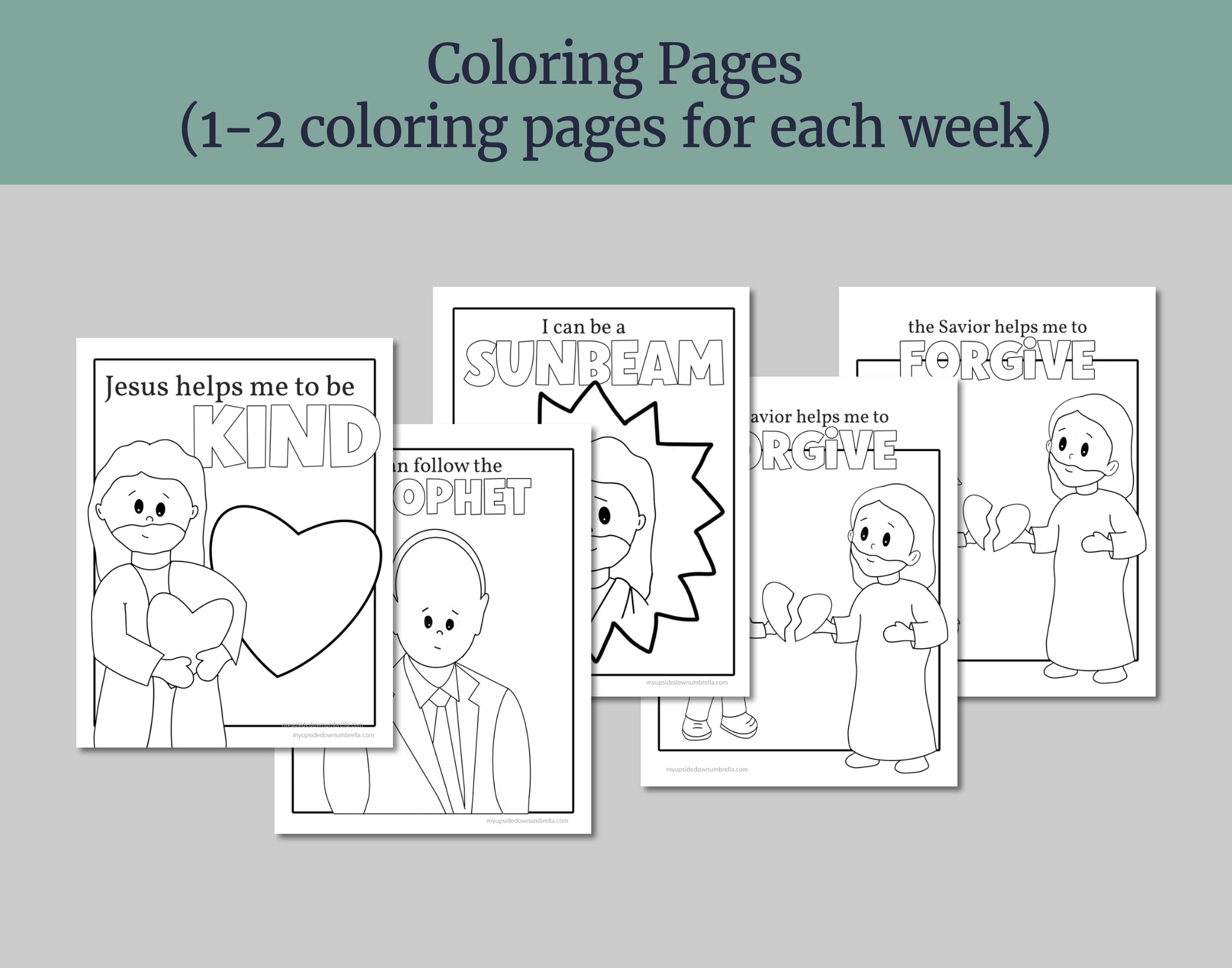 • Load image into Gallery viewer, Lesson helps for LDS nursery leaders and nursery teachers for Come Follow Me 2025,  Come Follow Me for toddlers, Family scripture study, come follow me for families, FHE lesson outline, nursery lesson outline, nursery coloring pages, toddler coloring pages, nursery coloring pages, primary activities, activity pages, nursery kids, nursery lesson plan, family home evening