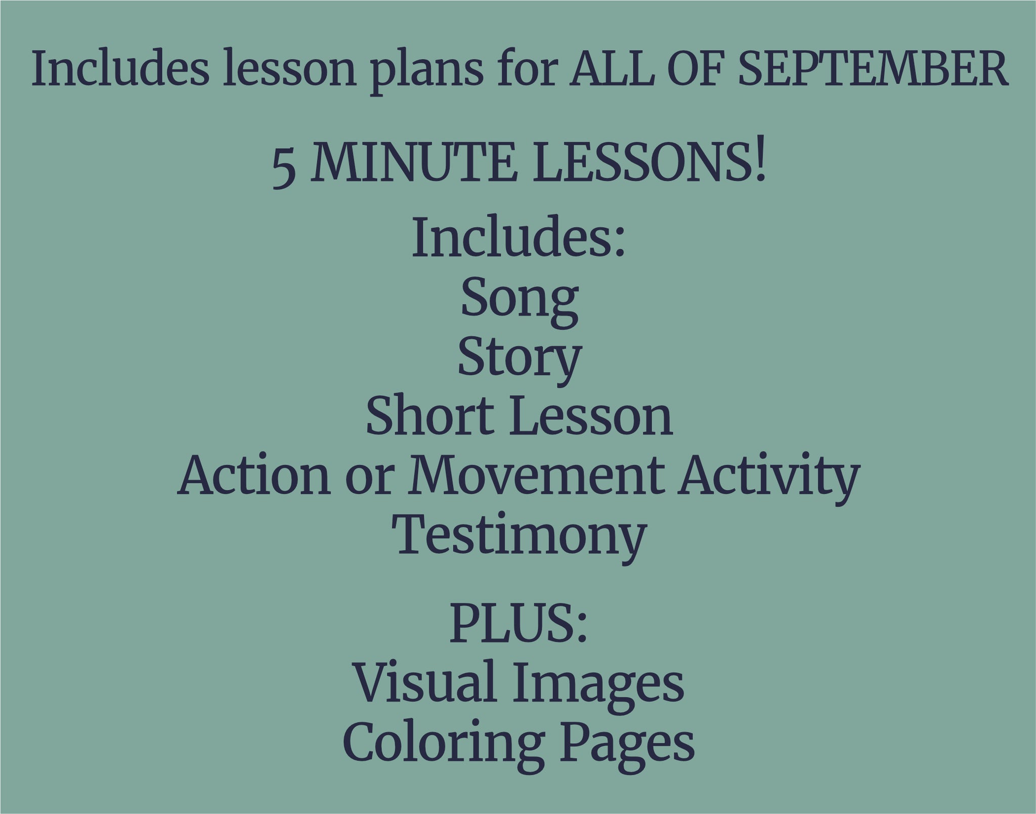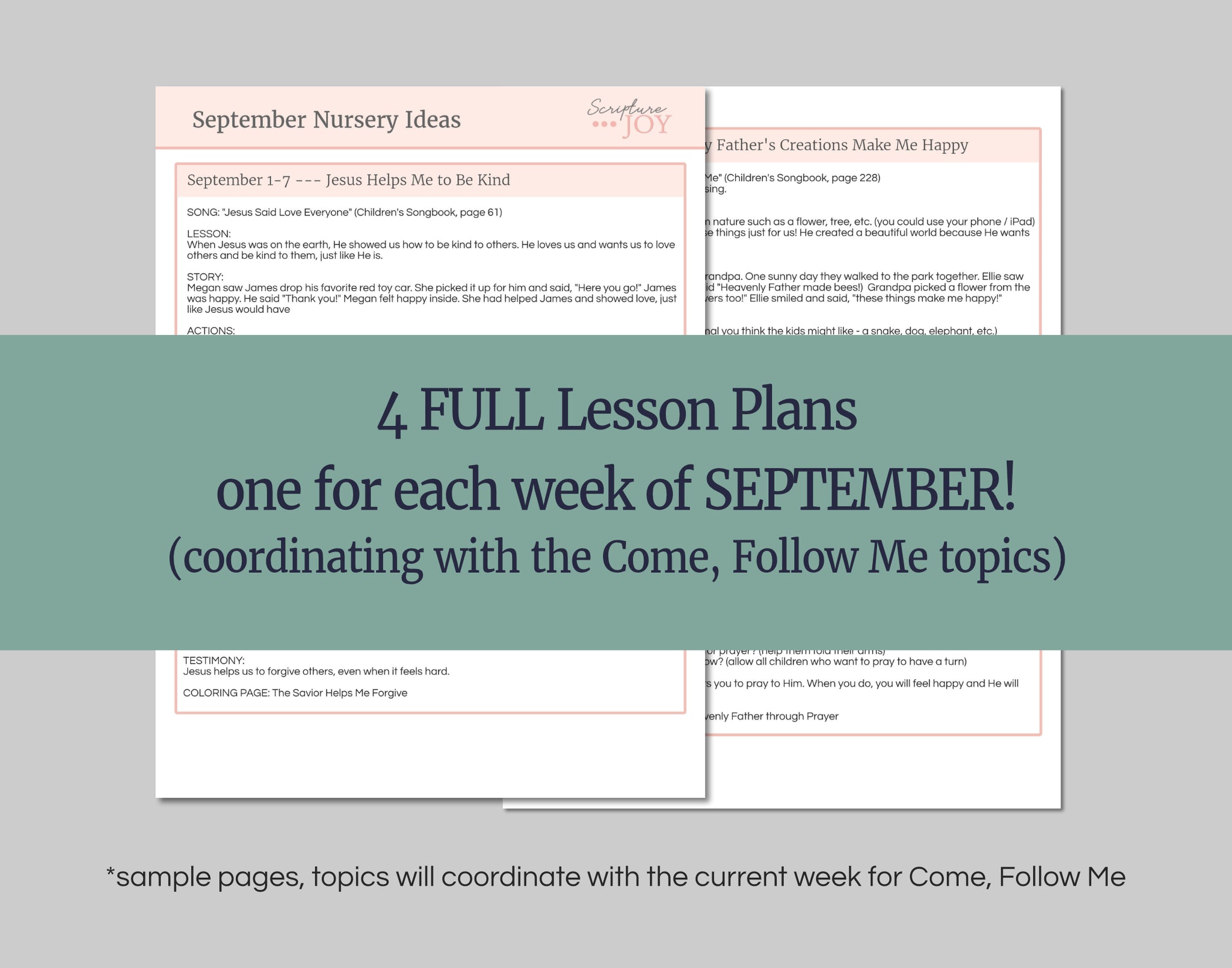 September Full MONTH NURSERY Lesson Helps, Come Follow Me for Toddlers | 5 Minute Lesson Outline & Coloring Pages | Nursery Children age 1-3