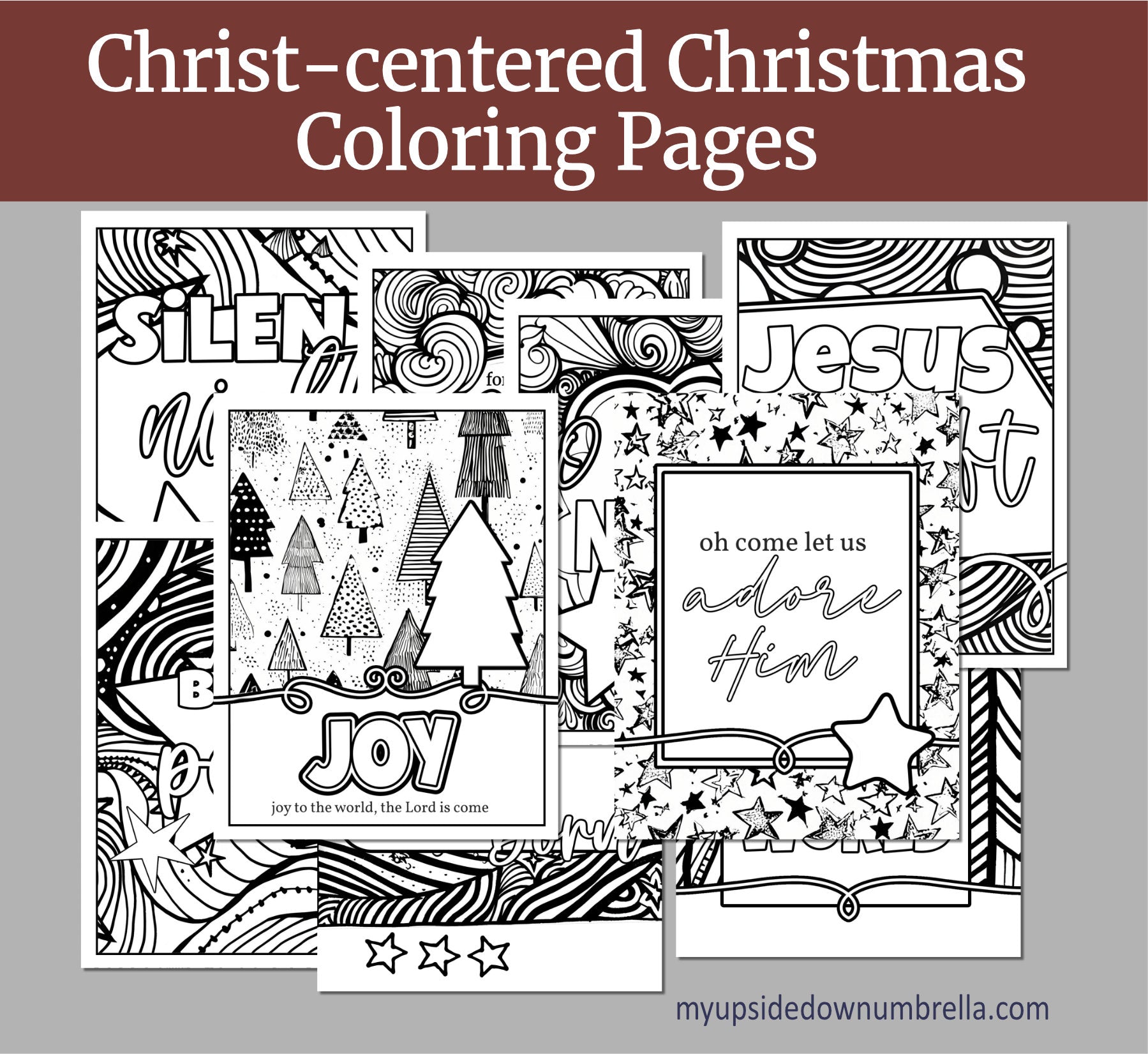 Includes 10 Christ-centered coloring pages. Each coloring page displays a sweet Christmas message.