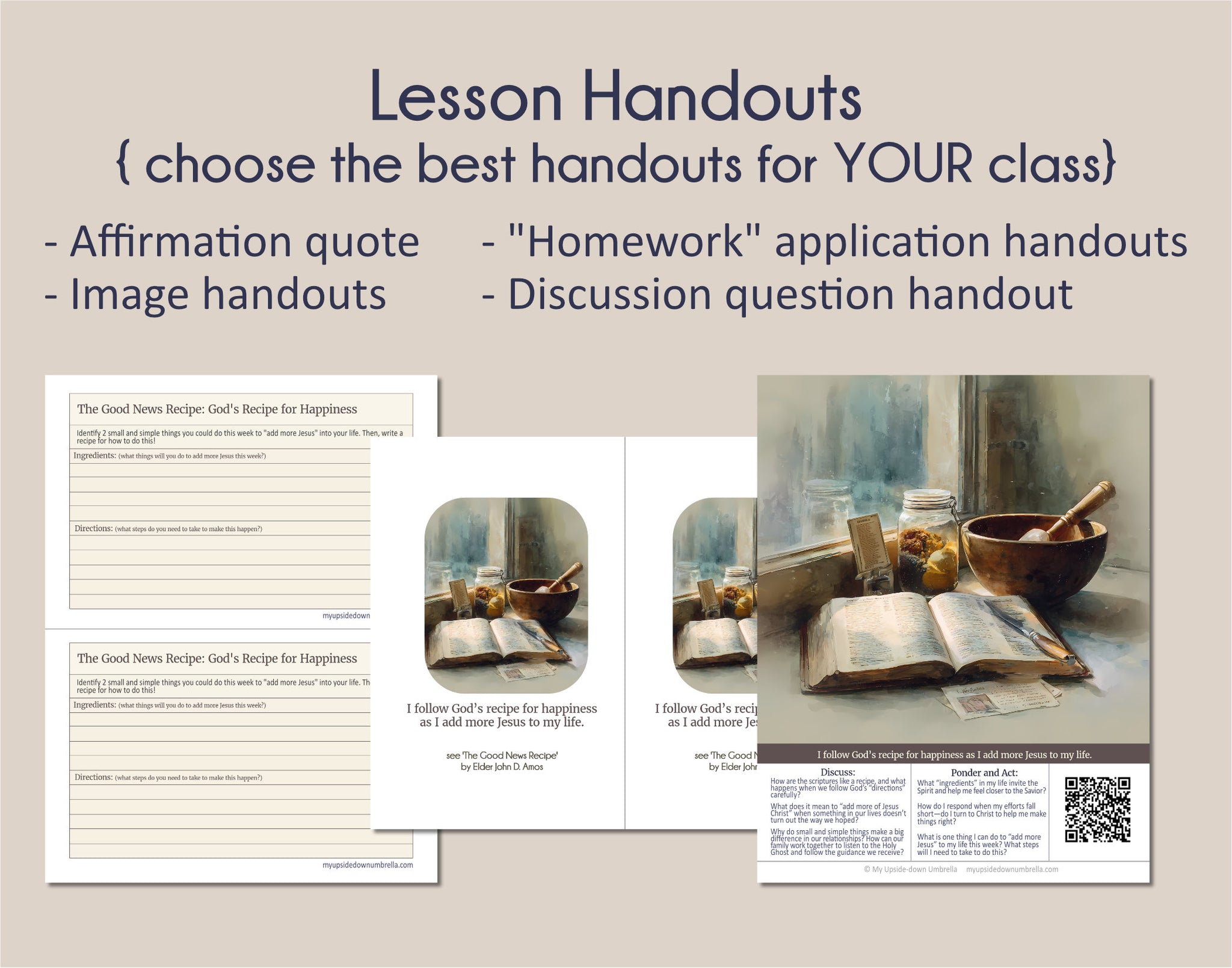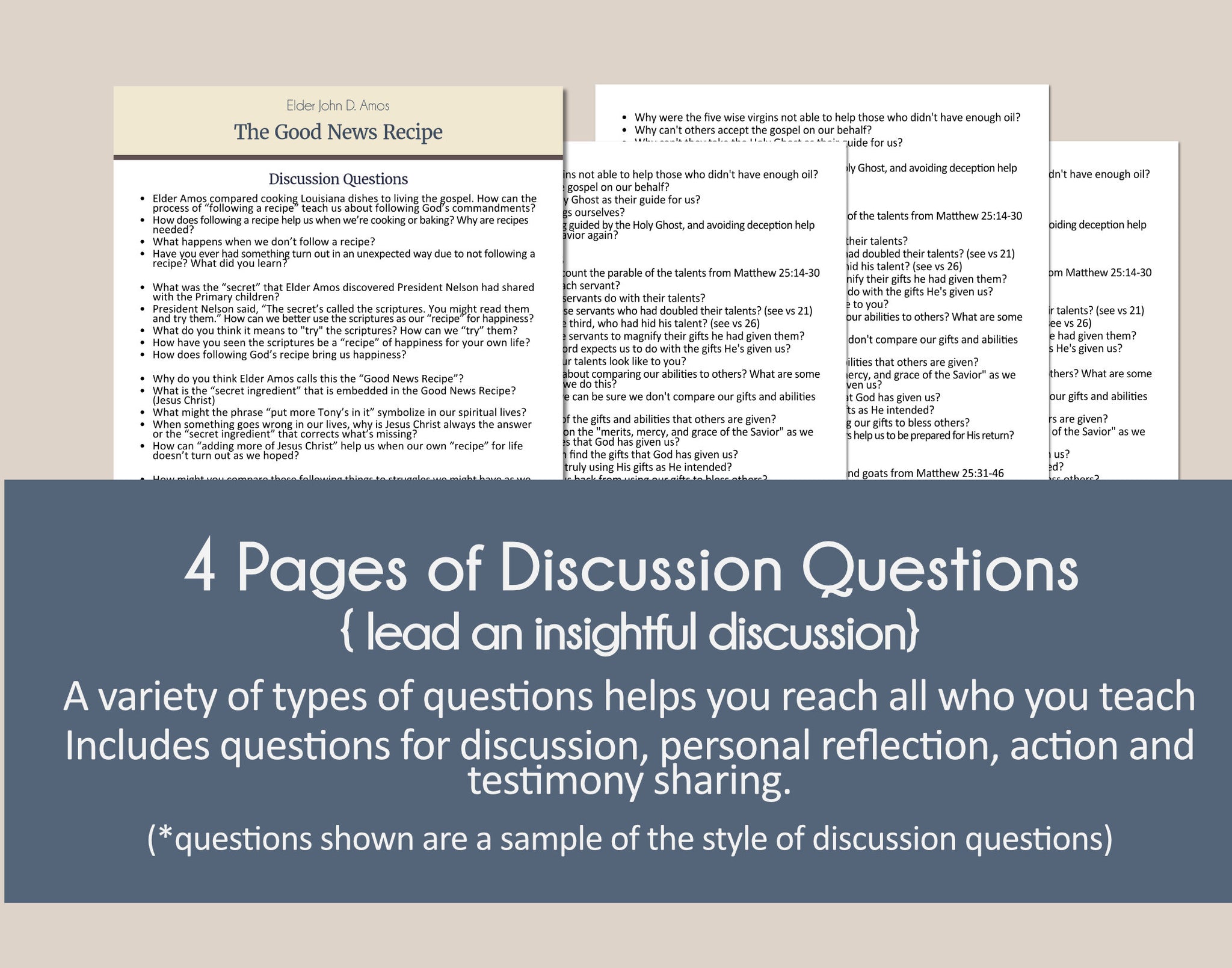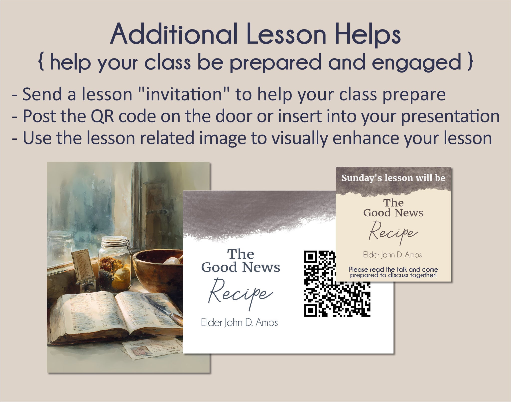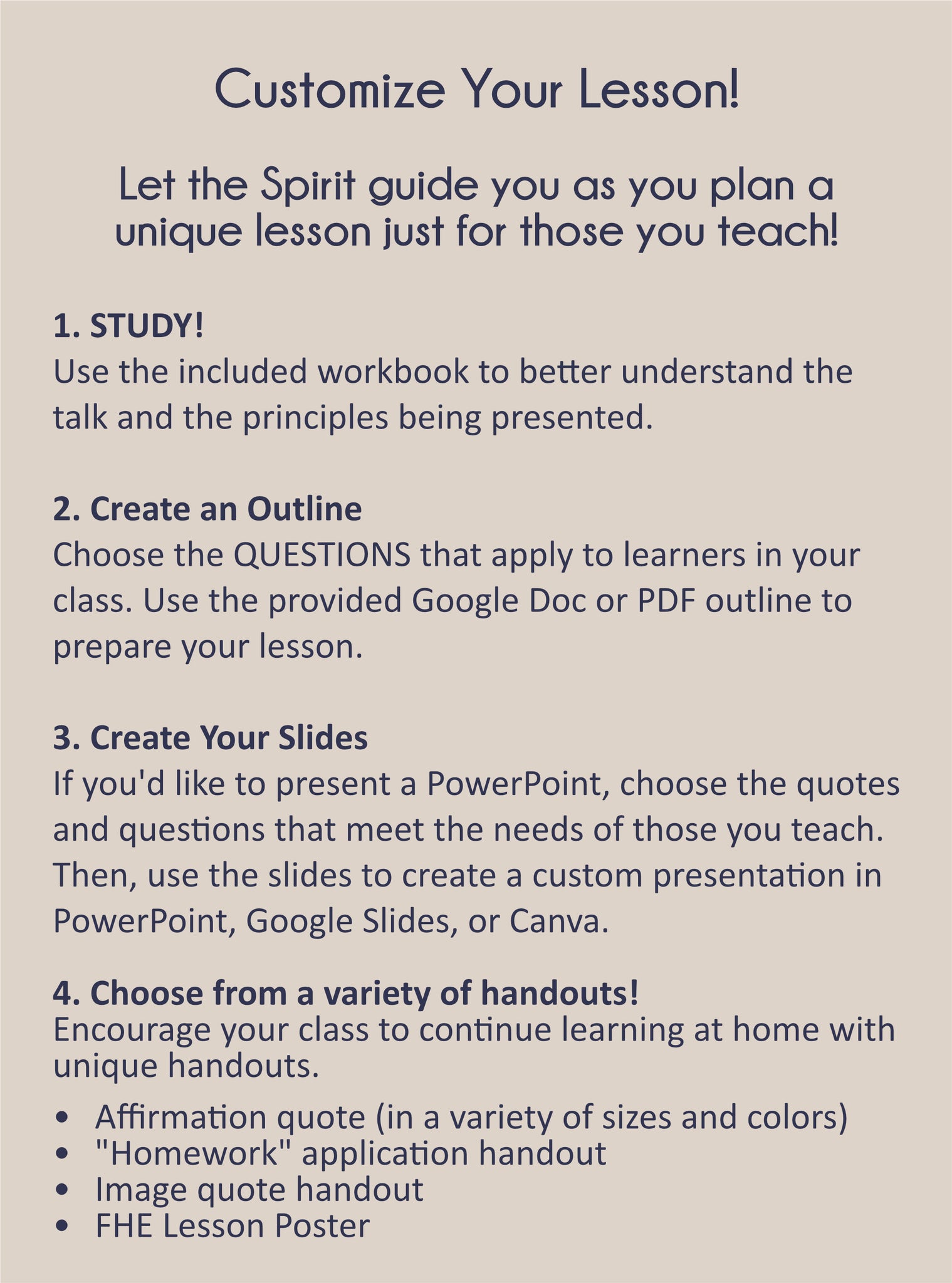 The LESSON OUTLINE is provided in a PDF and Google Docs format and helps you to gather your thoughts and follow the Spirit as you create a lesson that meets the needs of those YOU teach.
