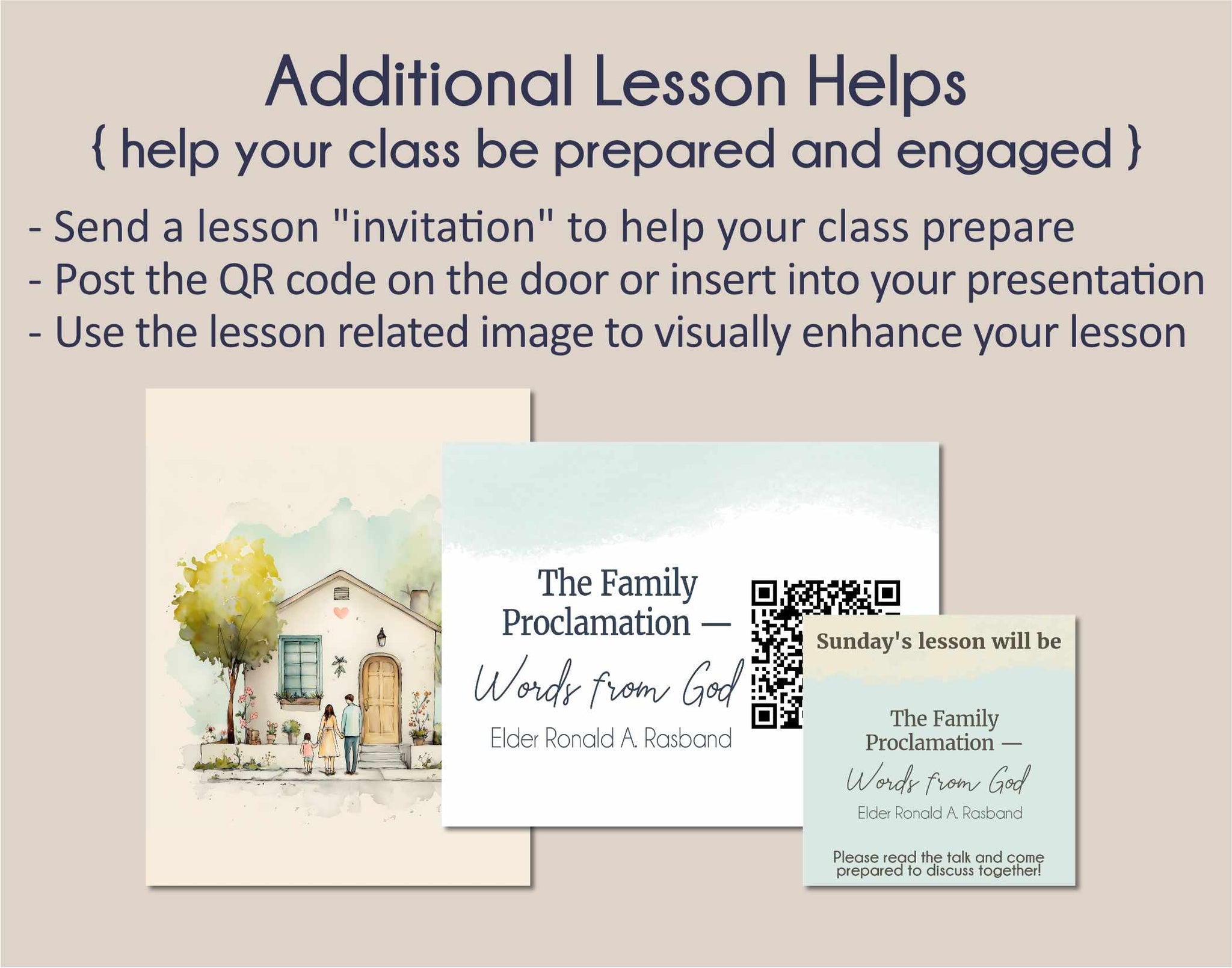 This kit also includes additional lesson helps: printable affirmation quotes, QR code, unique class handouts and a fun lesson “invitation.”