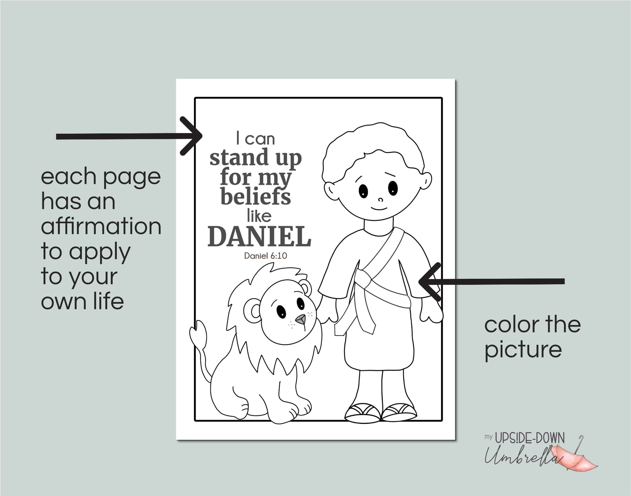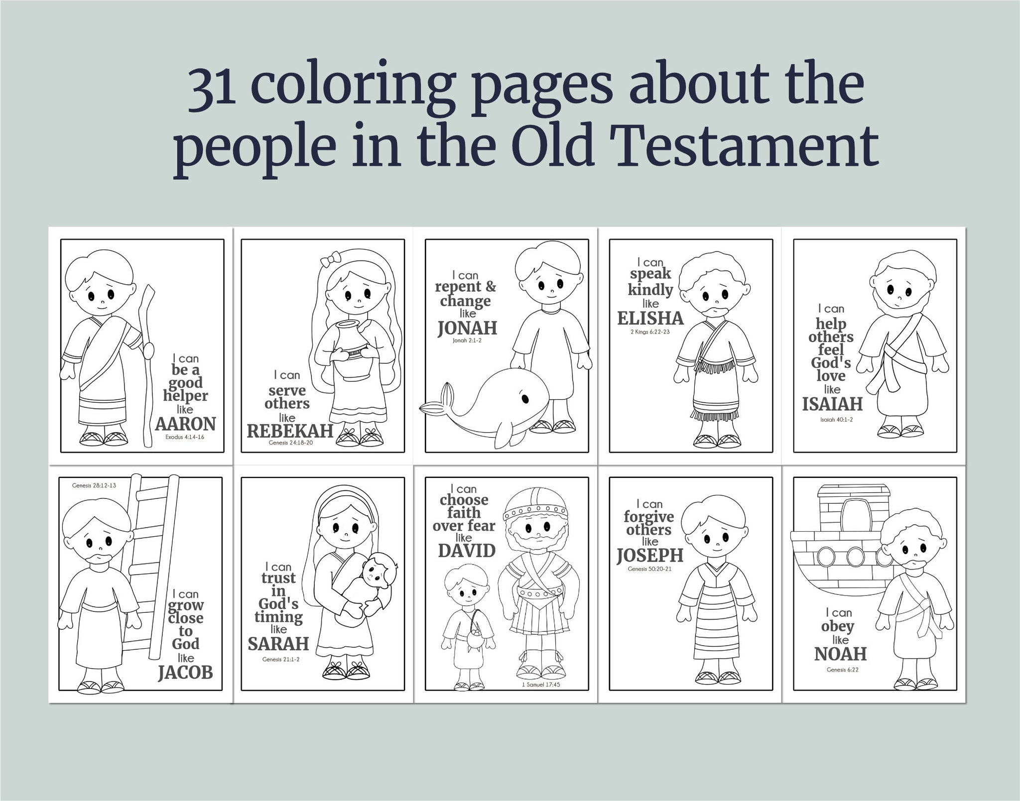 Each coloring page has a cute picture to color, along with a short affirmation about the featured Bible character and how we can become like them!