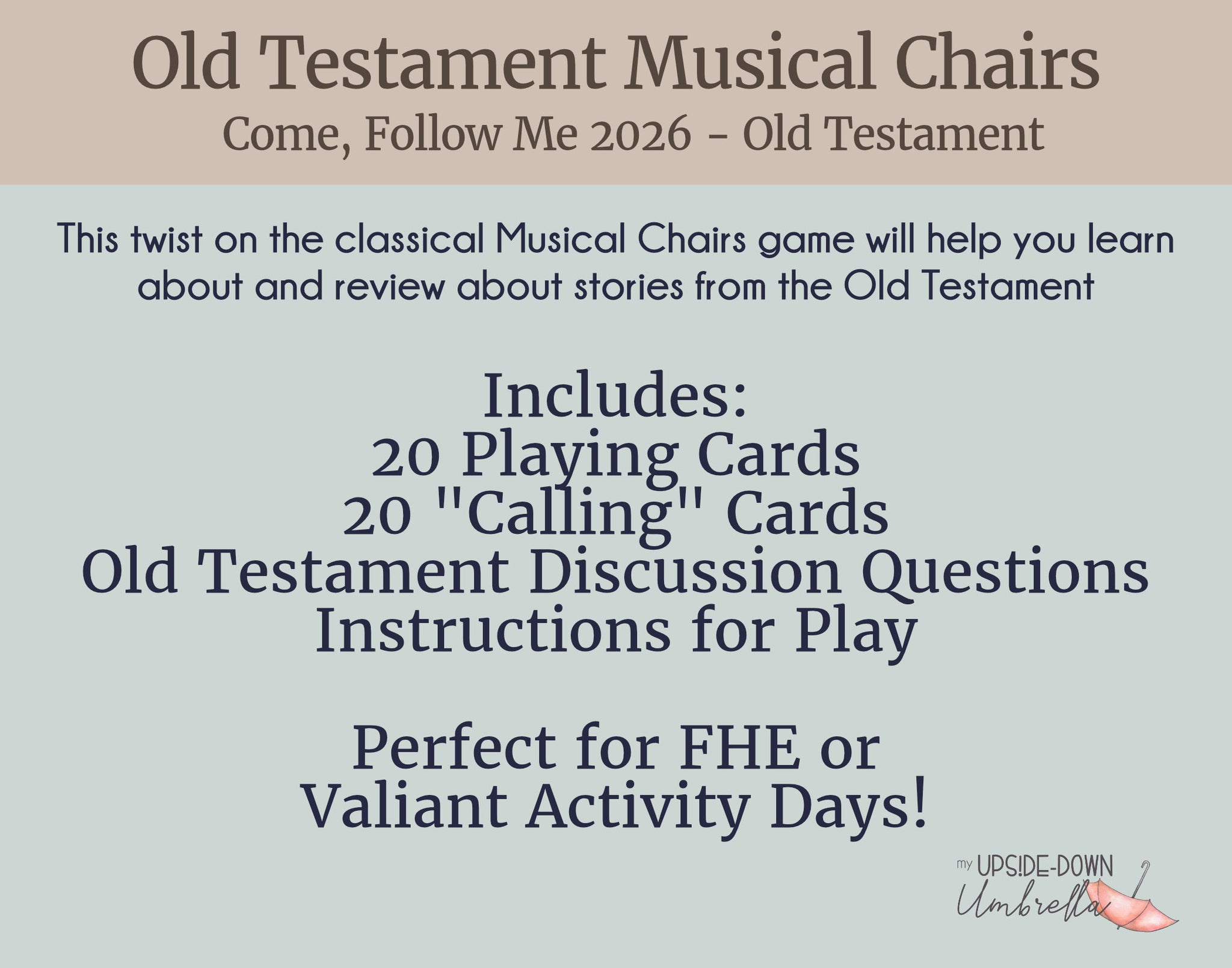 With a fun twist on this classic game, this Old Testament Musical Chairs game will have you laughing - while also helping learn some fun things about Old Testament people and stories.