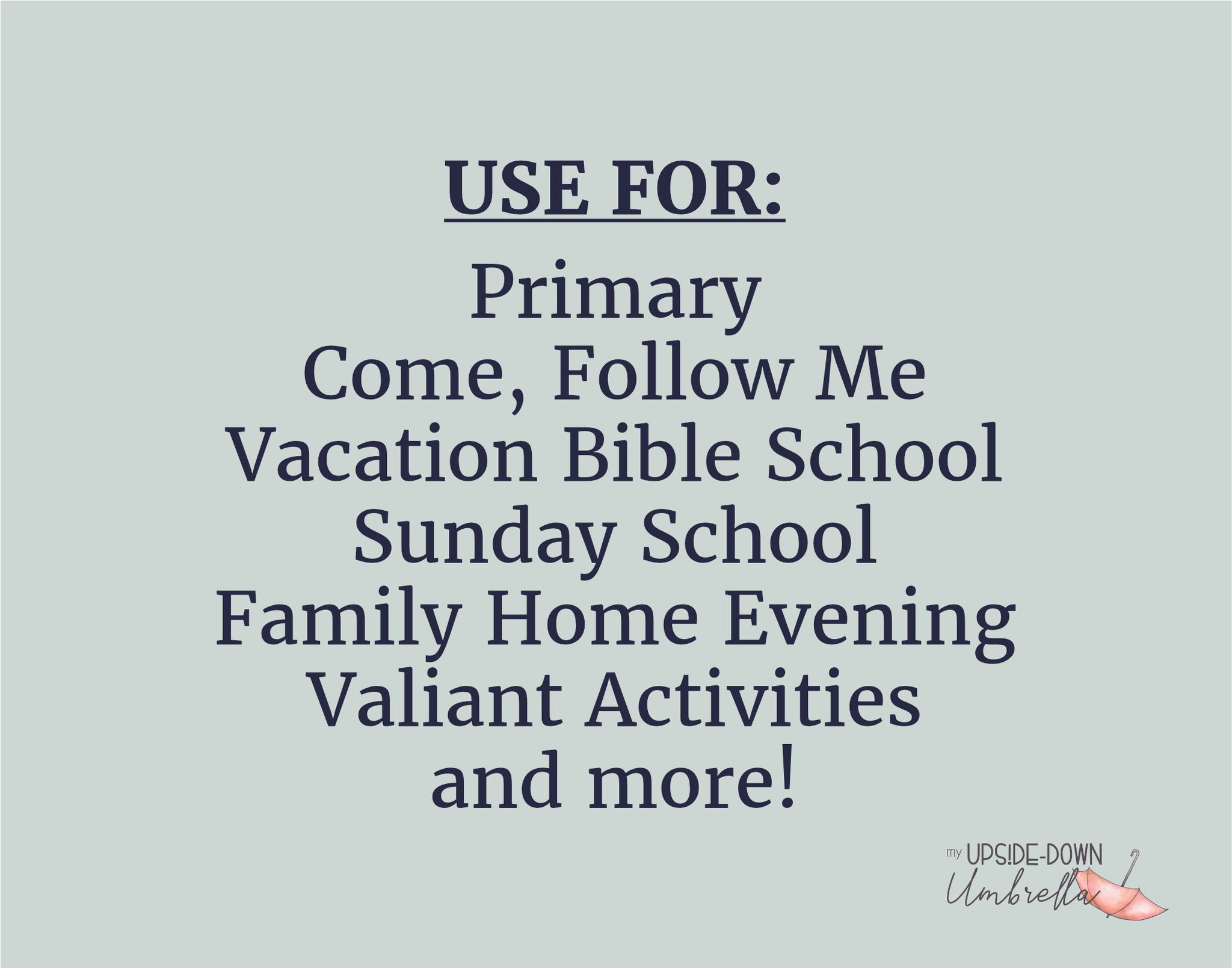 The LDS ideas and printables shared here are expressly my own and created by My Upside-down Umbrella. They are not created, provided, approved nor endorsed by Intellectual Reserve, Inc. or The Church of Jesus Christ of Latter-day Saints.