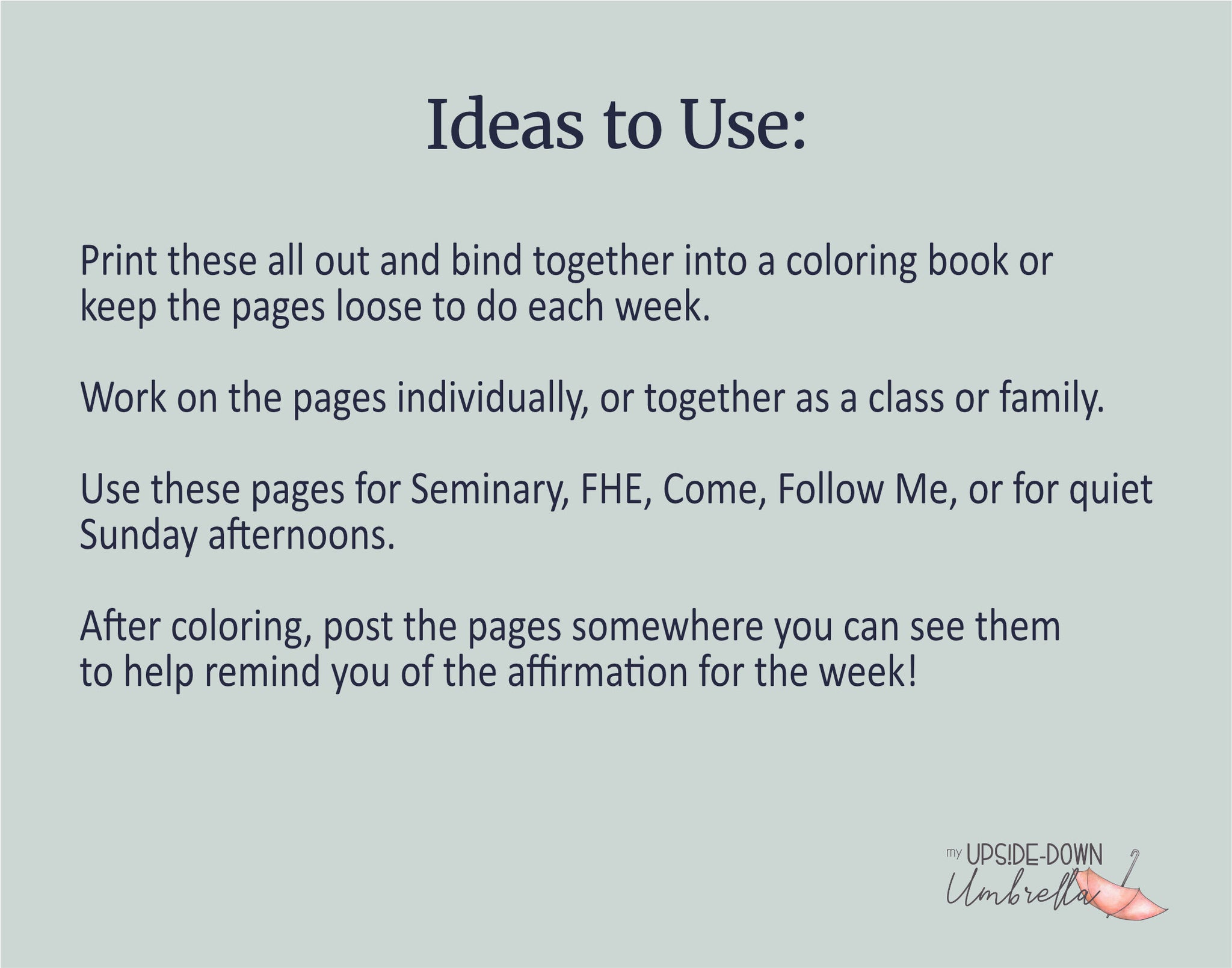 The LDS ideas and printables shared here are expressly my own and created by My Upside-down Umbrella. They are not created, provided, approved nor endorsed by Intellectual Reserve, Inc. or The Church of Jesus Christ of Latter-day Saints.