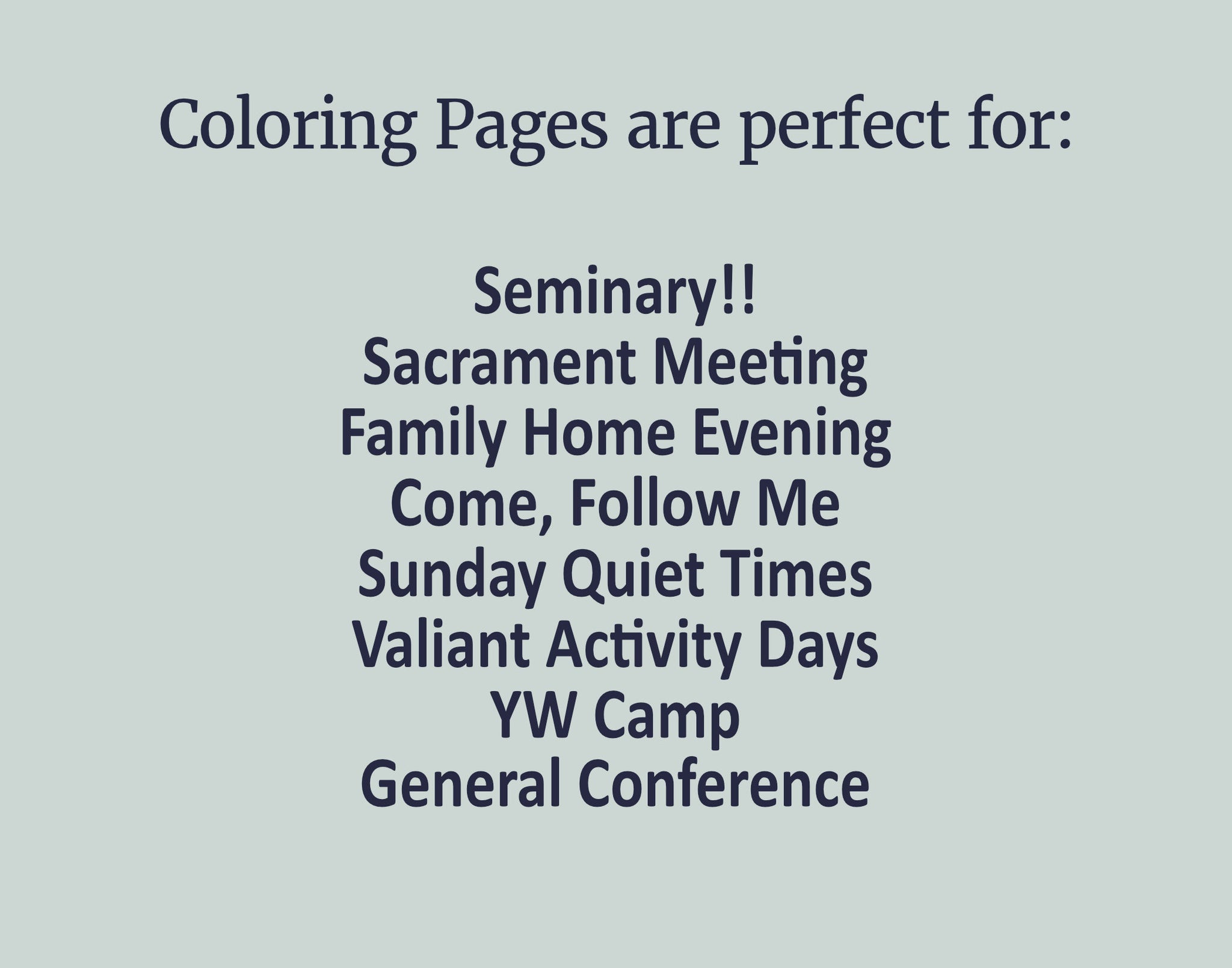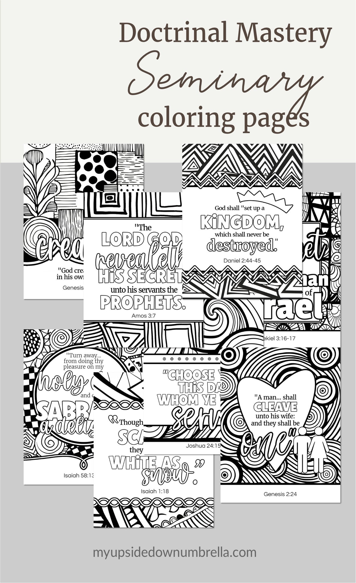 Each coloring page includes a reference from the Seminary Doctrinal Mastery scriptures.
