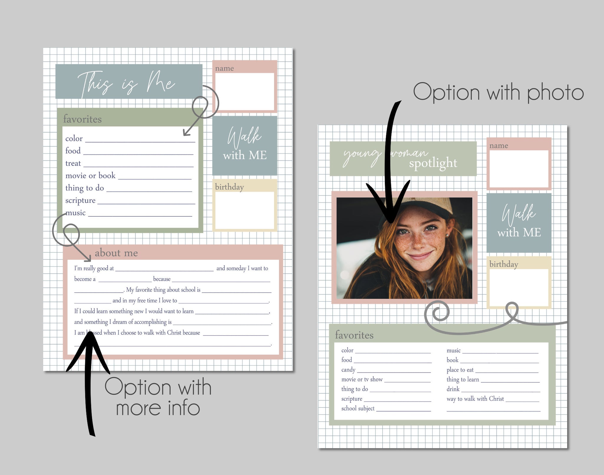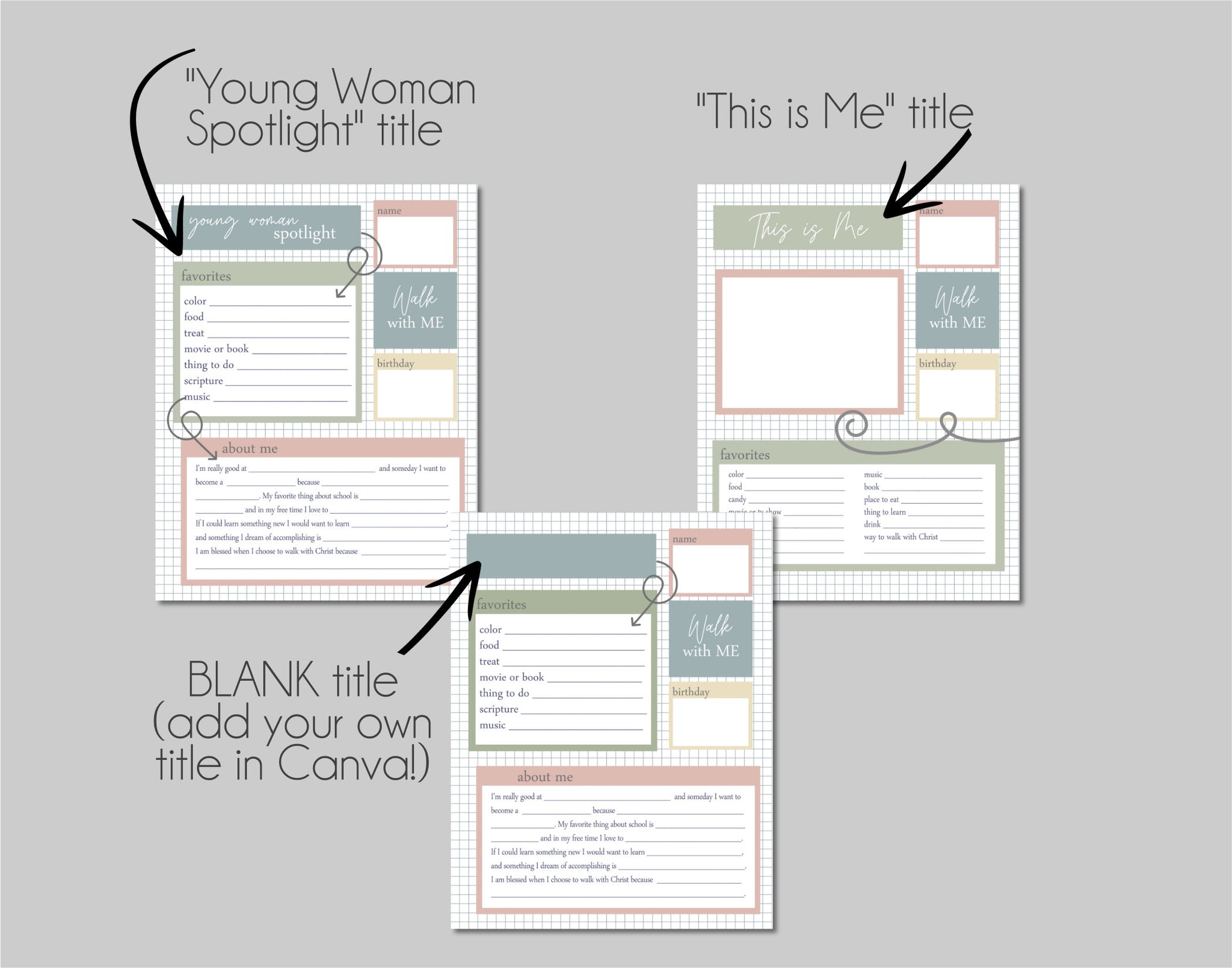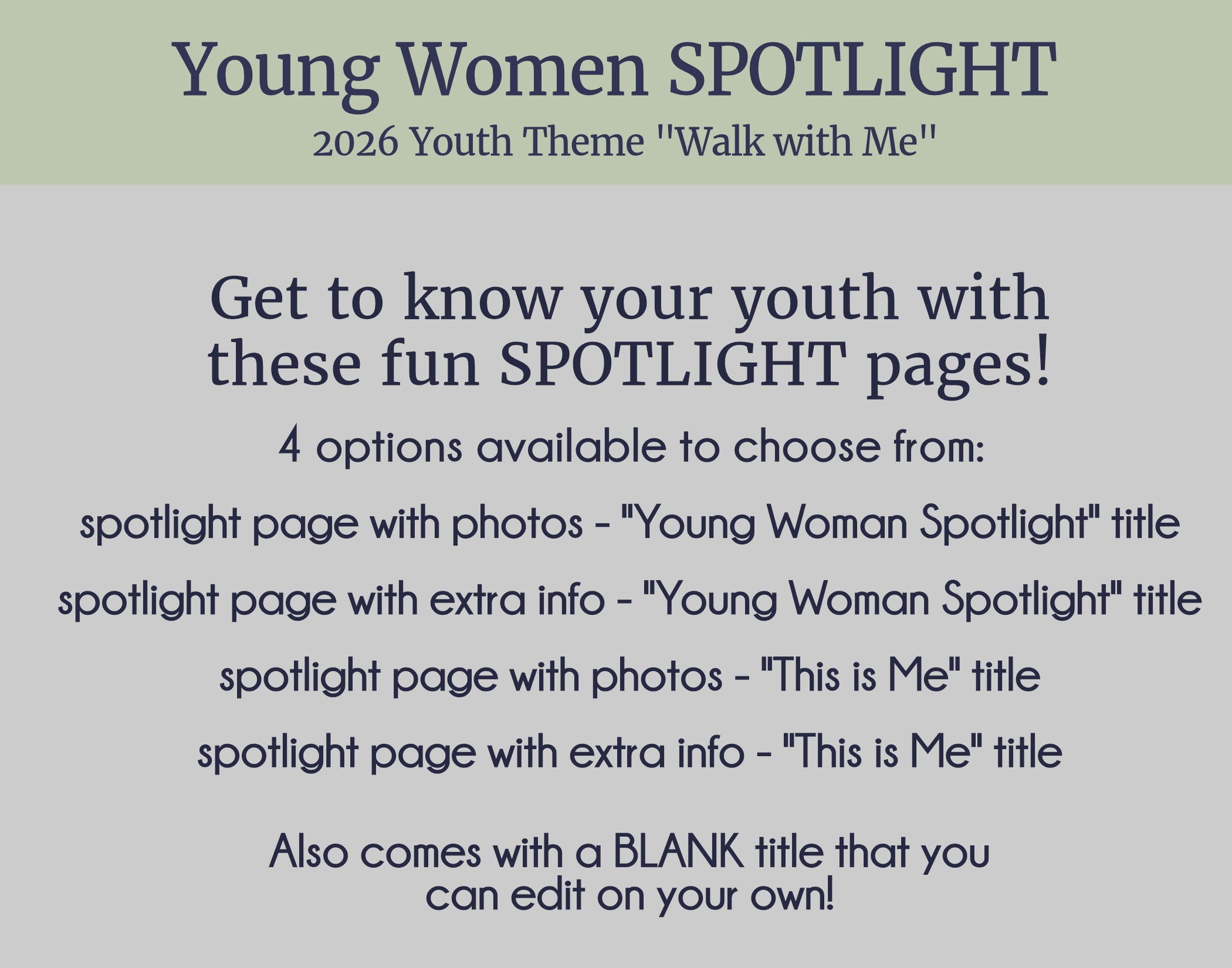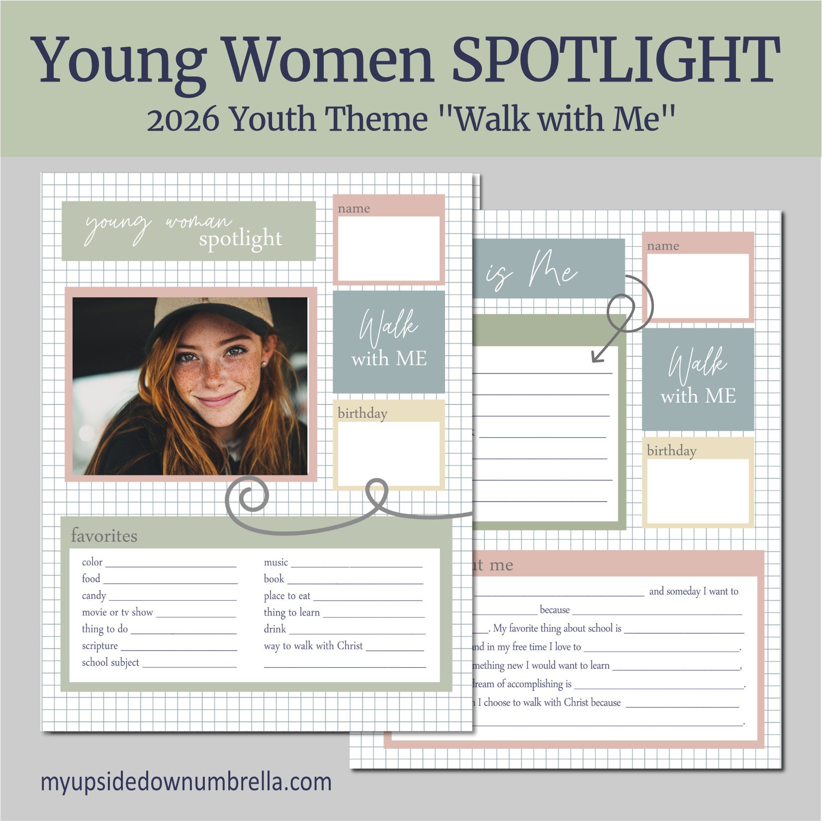 Three fun options of a spotlight sheet that focuses on the 2026 Young Women Theme - "Walk with Me"