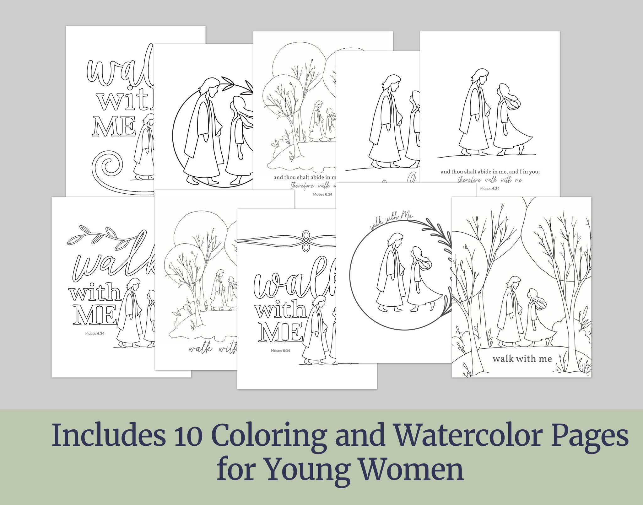 Young Women Watercolor and Coloring Pages | Walk with Me | Moses 6:34 | 2026 LDS Youth Theme
