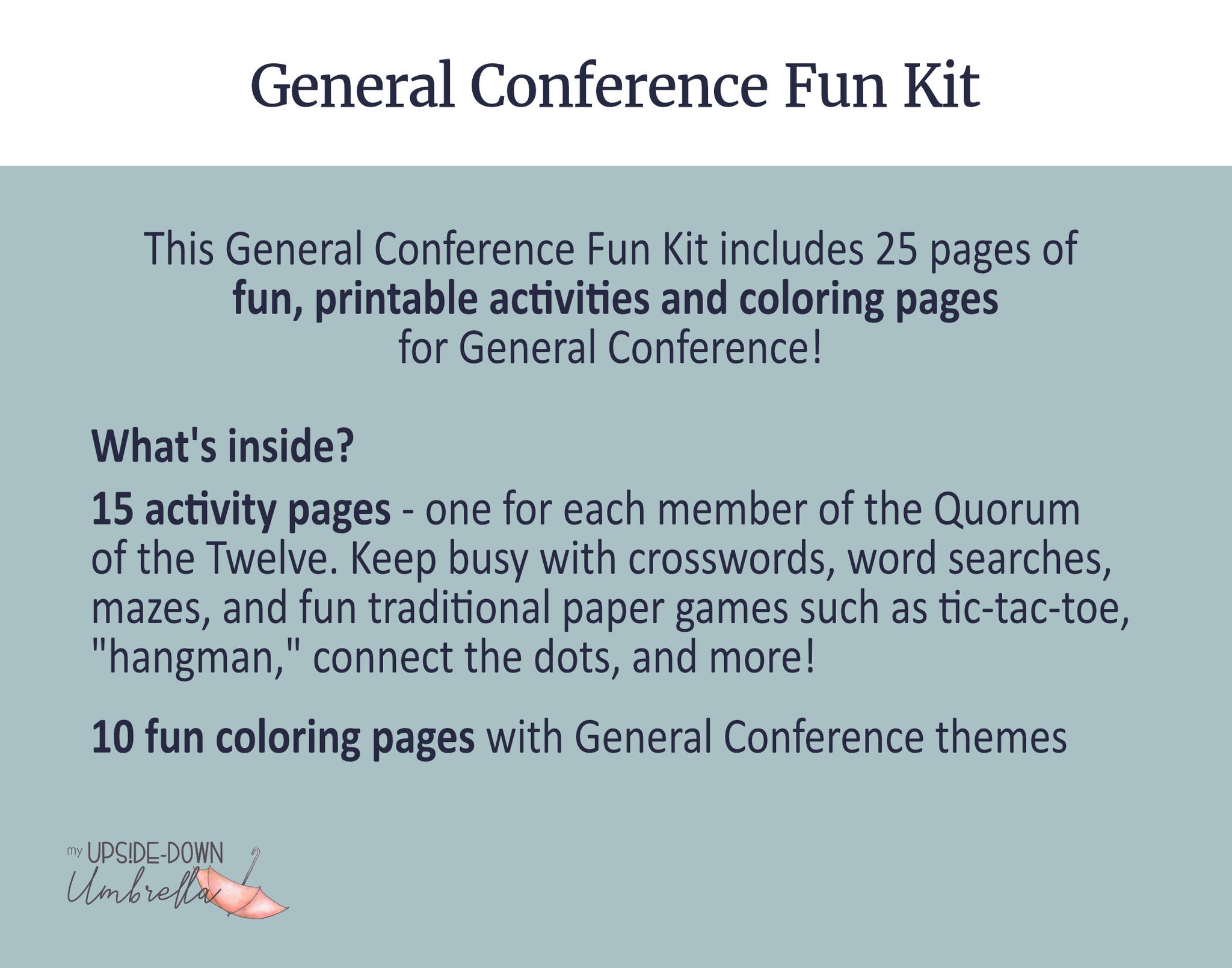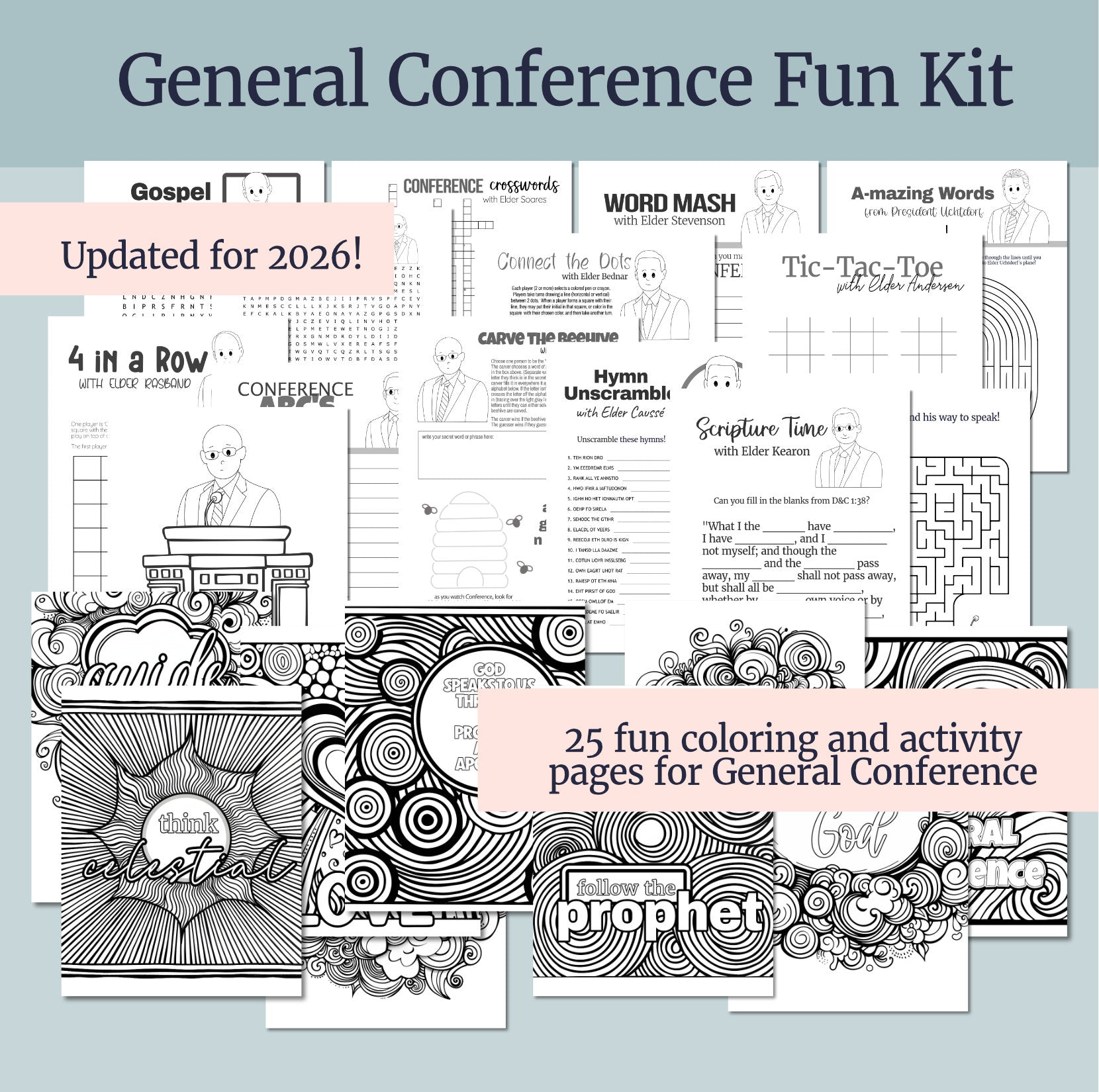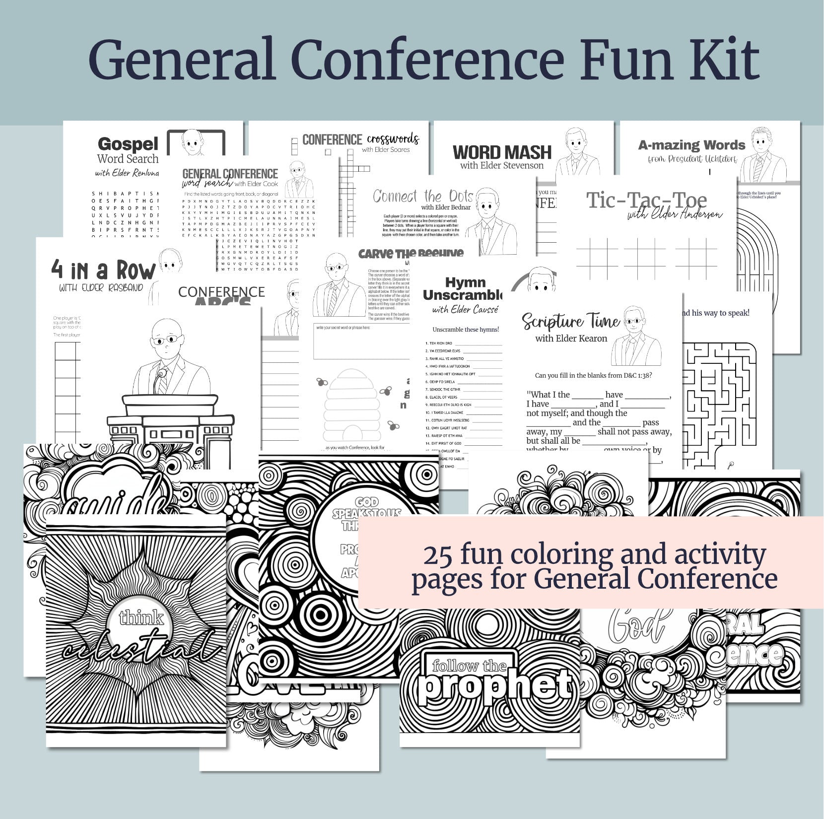 This kit includes 25 fun, printable games and coloring pages to keep your whole family busy during Conference!